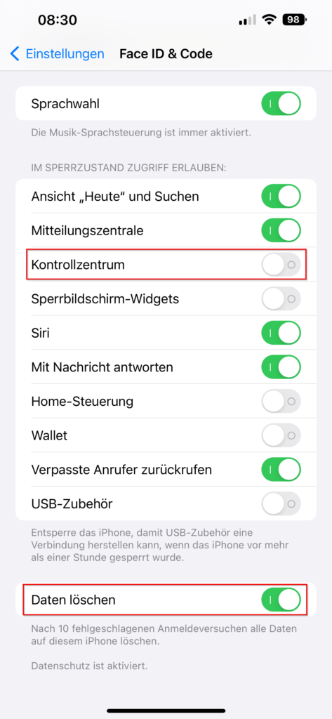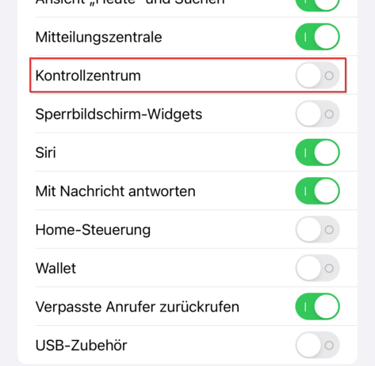 Deaktivieren Sie den Punkt „Kontrollzentrum“ und aktivieren Sie den Punkt „Daten Löschen“.