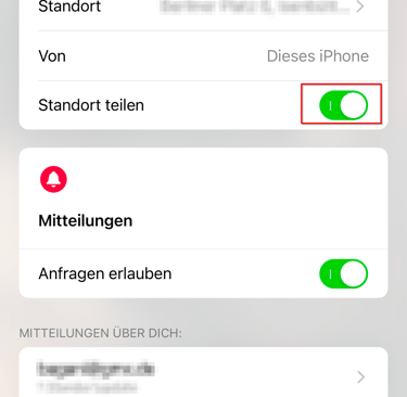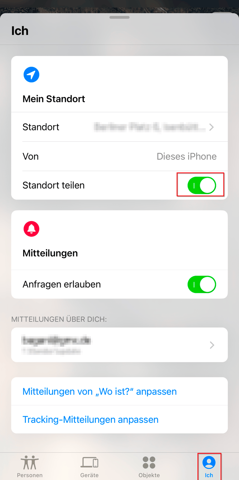 Gehen Sie auf die Registerkarte „Ich“ und aktivieren Sie „Standort teilen“.